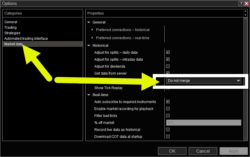 En el panel de control, presione TOOLS>OPTIONS> MARKET DATA y asegúrese que en "Historical>Global merge policy esté seleccionado: Do not merge