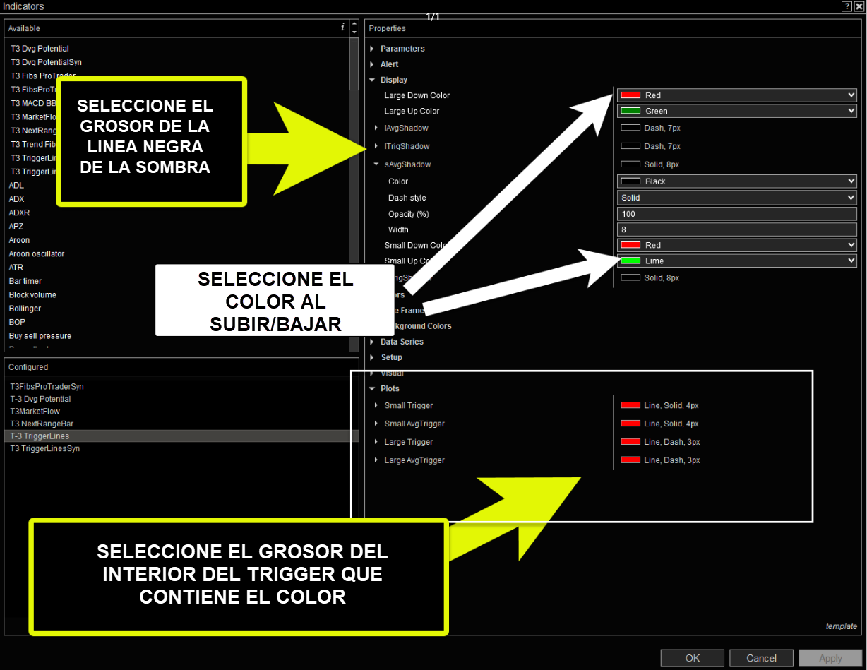 Las lineas de los triggers pueden personalizarse al gusto del usuario. Para esto presione el botón derecho del mouse sobre el gráfico. Seleccione INDICATORS>T3 TRIGGERLINES. Ahora ajuste el tamano de las lineas de los triggers, el color y el tamano de las sombras. La sombra puede verse como unas lineas negras detras de las lineas de los triggers para darle un contraste adicional.